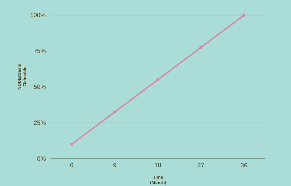 The NODEstream works on a time-based linear function, meaning the reservoir will gradually hold a smaller percentage of your NODE and thus more NODE is made instantly available from your staking rewards. At the end of the NODEstream The reservoir will no longer hold any NODE and 100% of your staking rewards will be instantly claimable.