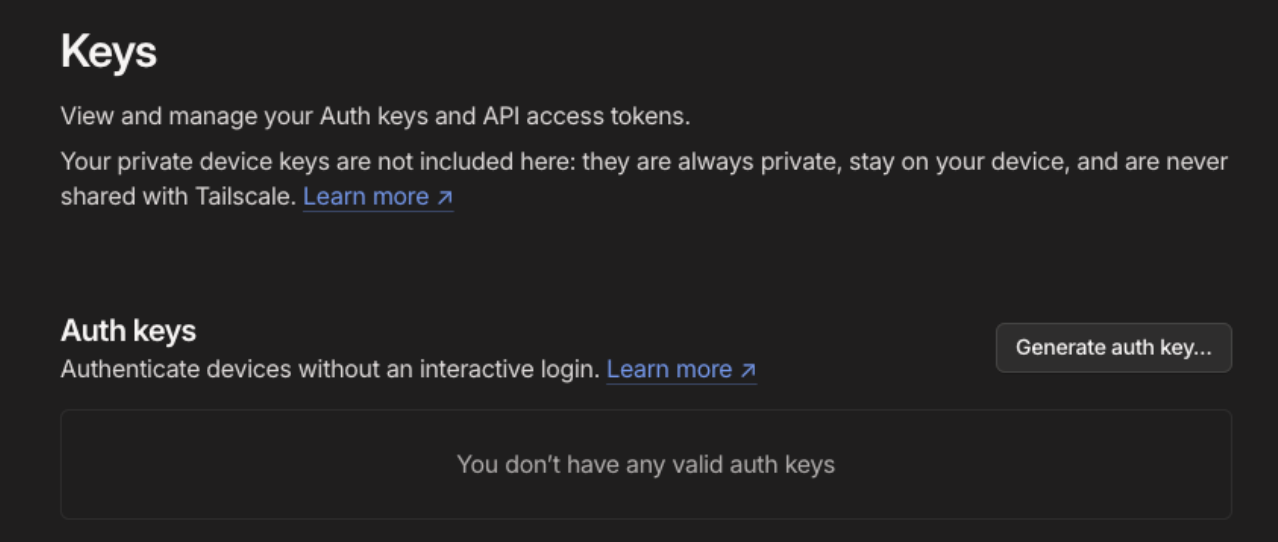 1. Log in to Tailscale and navigate to Tailscale Admin Settings. Click on Generate auth key.
