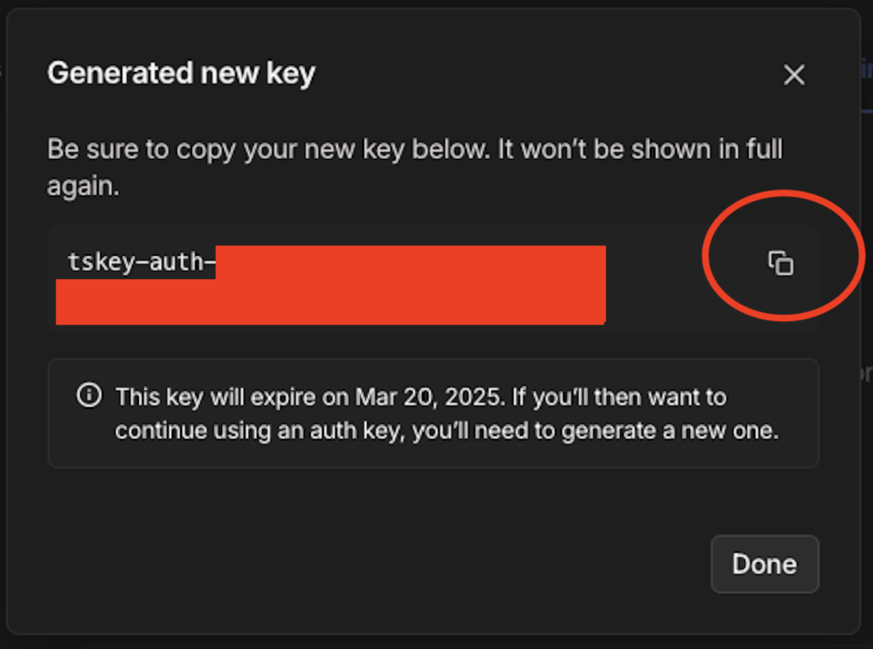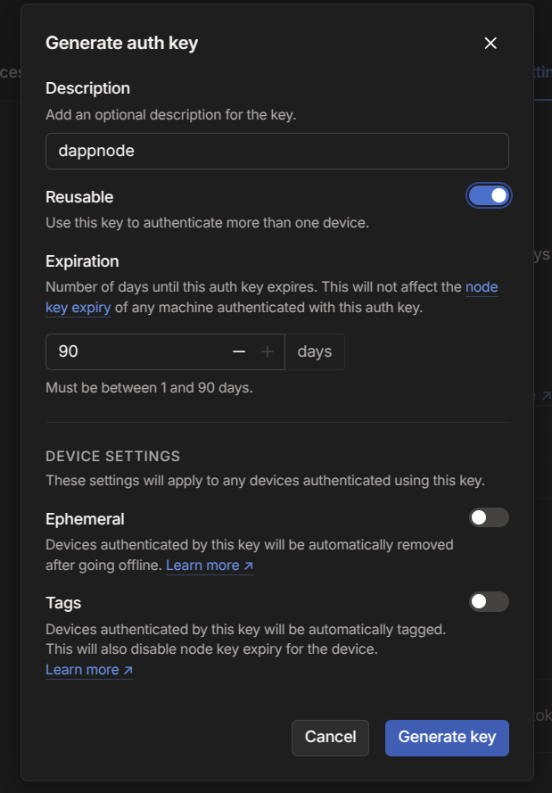 1. Create a new auth key. Any name will work. We recommend activating the "Reusable" option so you can use the same key multiple times.