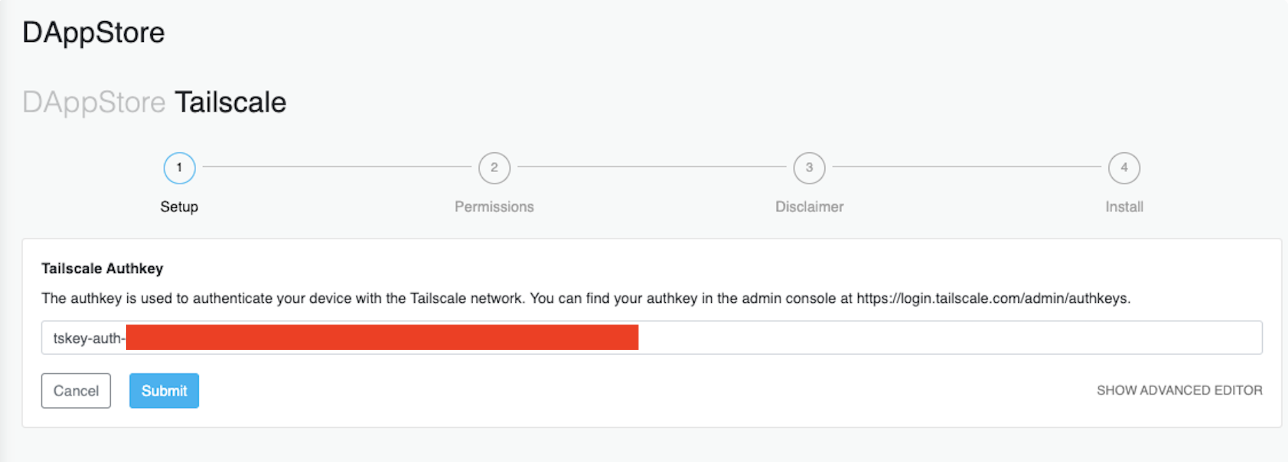 4. Go to the Tailscale package in Packages tab and enter the auth key you created during installation.