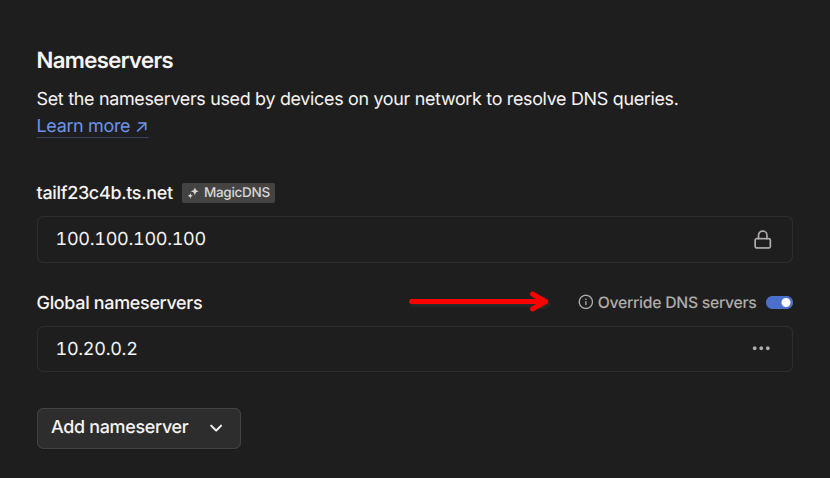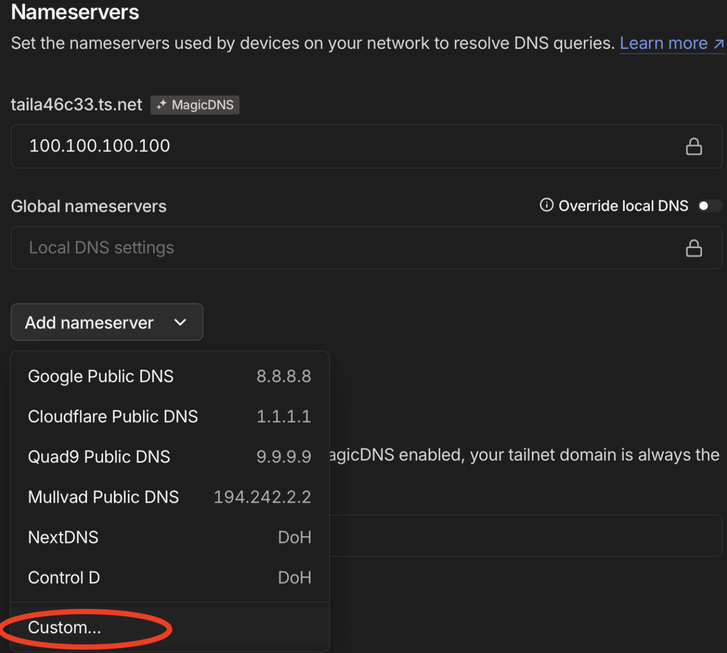 The following screenshot shows a configuration that only uses Dappnode's DNS server for services under the dappnode, dappnode.private and dyndns.dappnode domains, while using the default Tailscale DNS server for everything else.